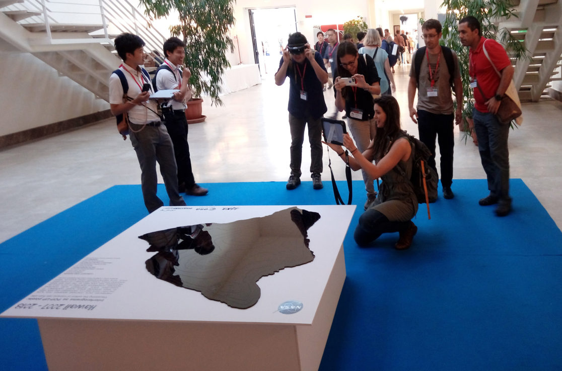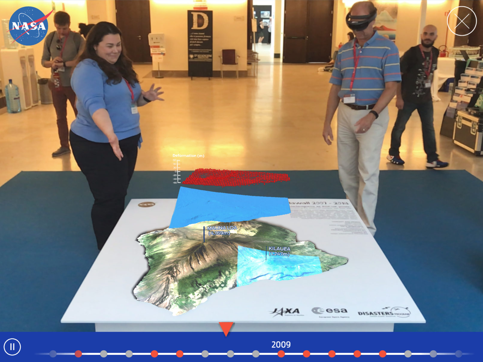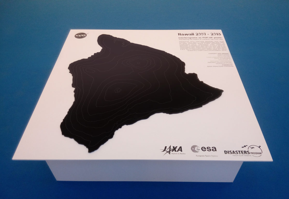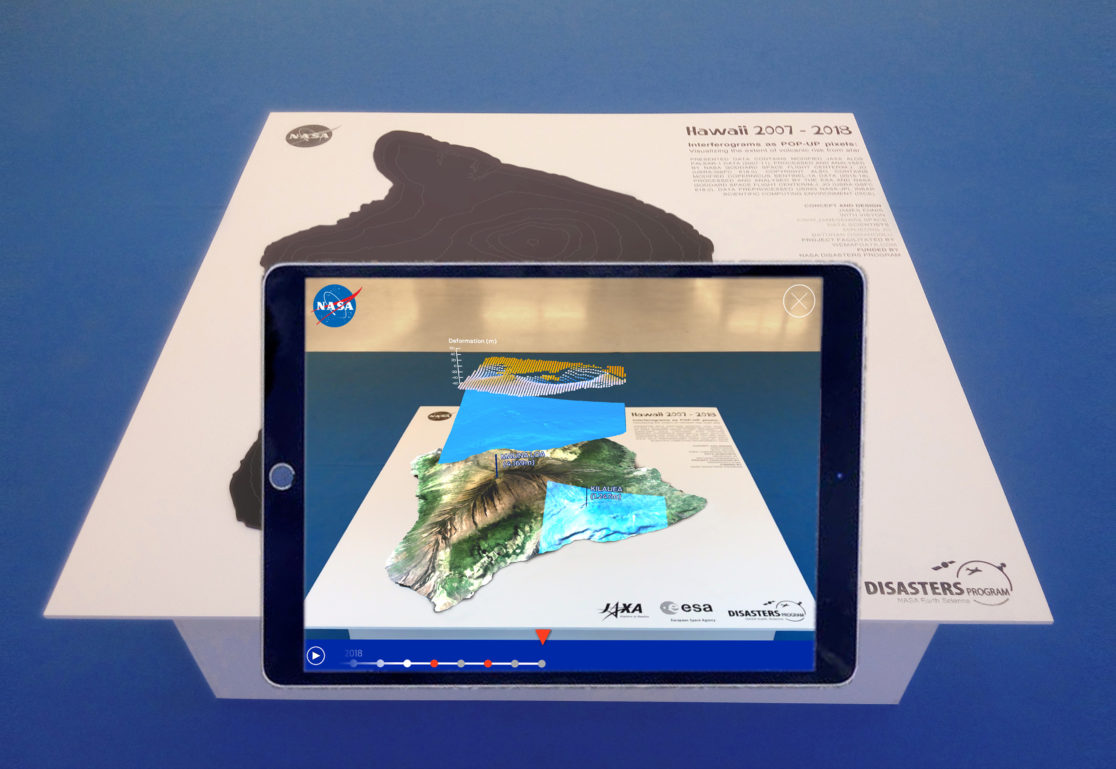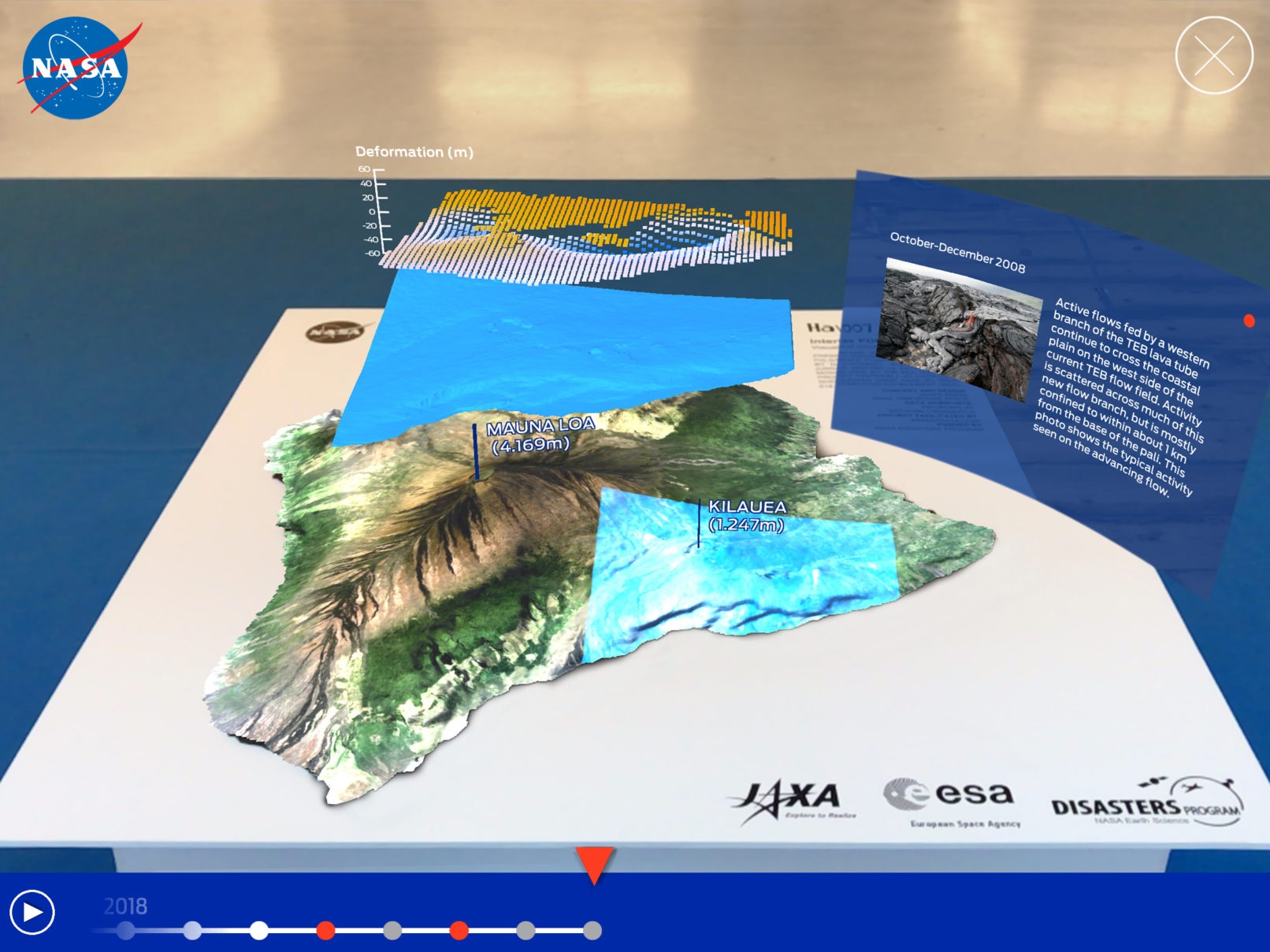 The Installation is visualised using only Satellite time series data, taken over 10 years showing the deformation of topography on the Hawaii Big-Island +/- 60m. Hawaii was chosen for this particular installation because of the activity on Kilauea volcano, which in fact erupted in June 2018 during the development phase of the project. The eruption or collapse of the lower east riff zone is clearly evident in the AR environment.
