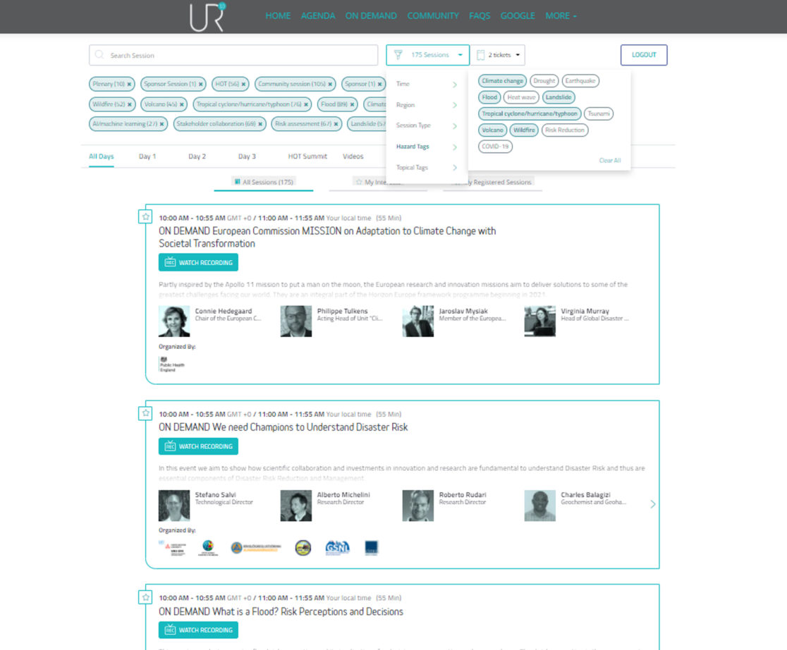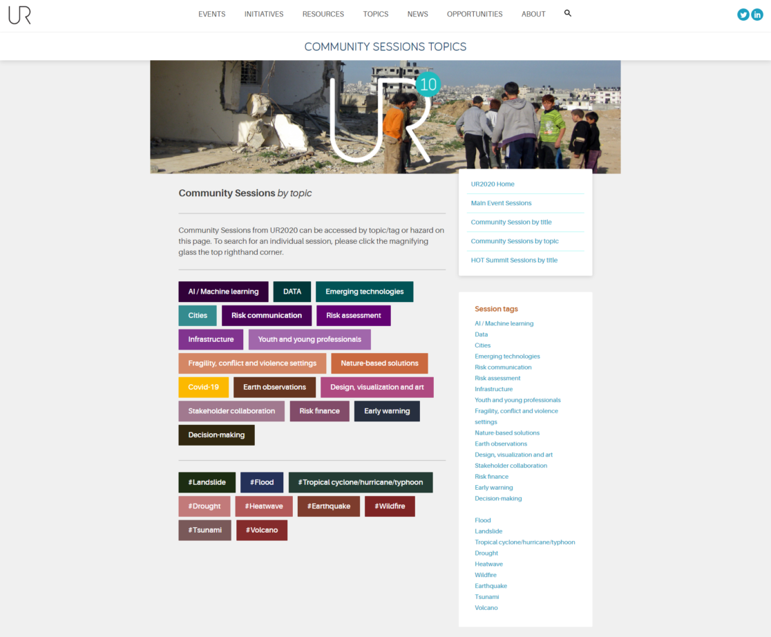 All Agenda items had a tagging system to allow users search by theme and key word, the tags work for both the UR2020 Event platform and the Understandrisk WordPress site. UR2020 hosted 138 hours of content over three days with 534 speakers in 120 sessions.